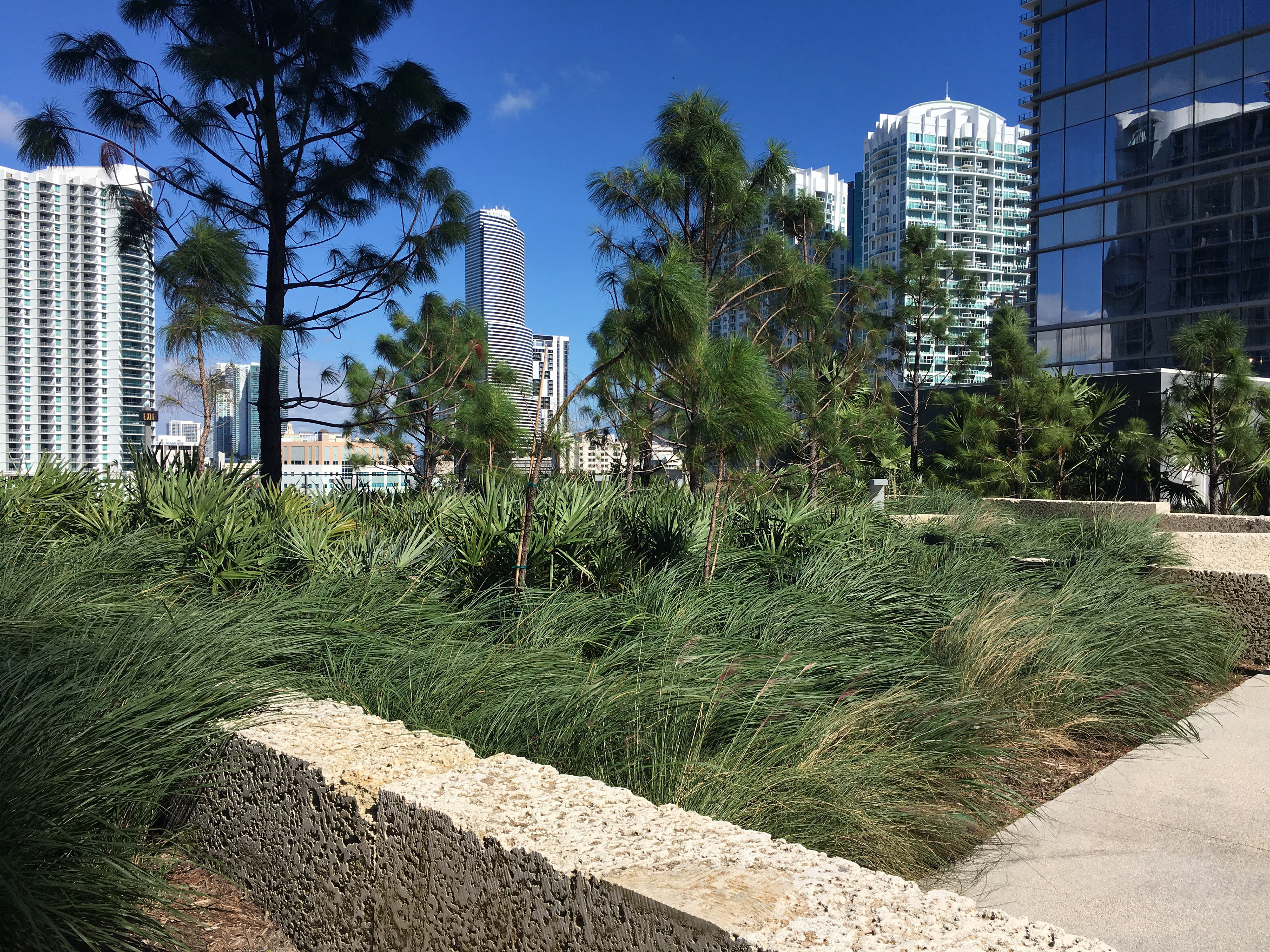 ecosystems: The scale of planting provided an opportunity to test viability of three coastal plant communities in an over-structure context. Working closely with native plant ecologists, plantings of dune, coastal prairie and pine-rockland canopy and understory species were selected. The loose native plantings represent the range of textures and natural environments endemic to the site, bringing a sense of authentic Florida to an urban center with global presence. The plantings have thrived suggesting expanded possibilities for urban biodiversity as a means of supporting populations of threatened endemic coastal plant communities.
